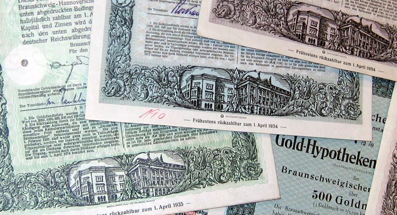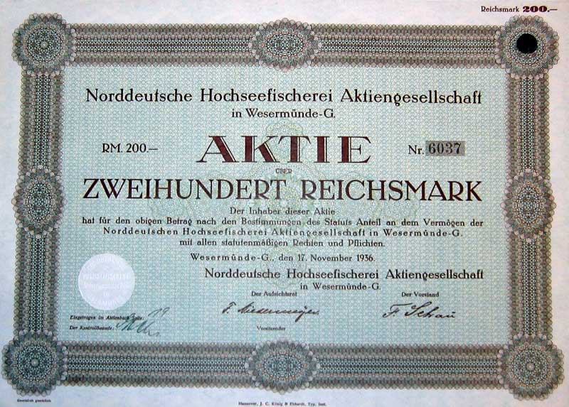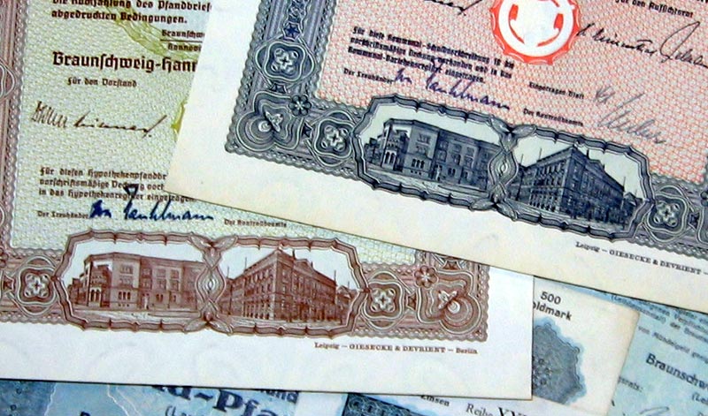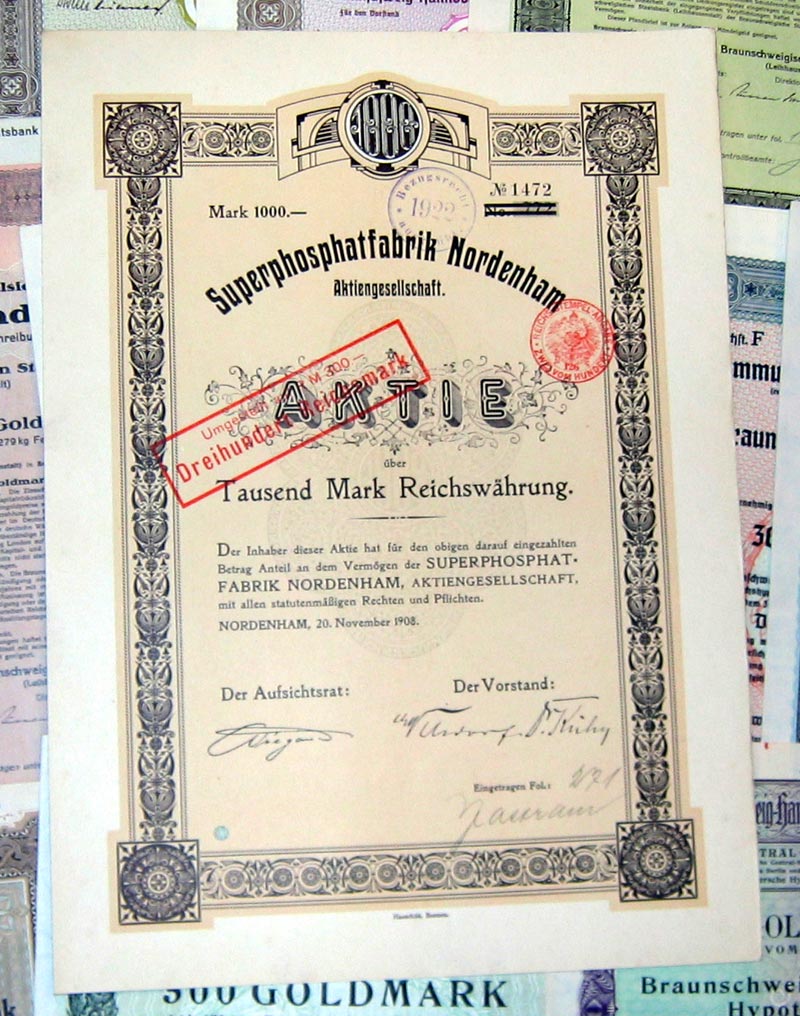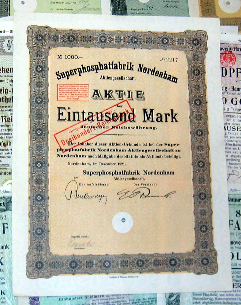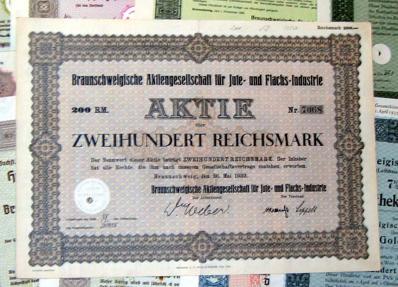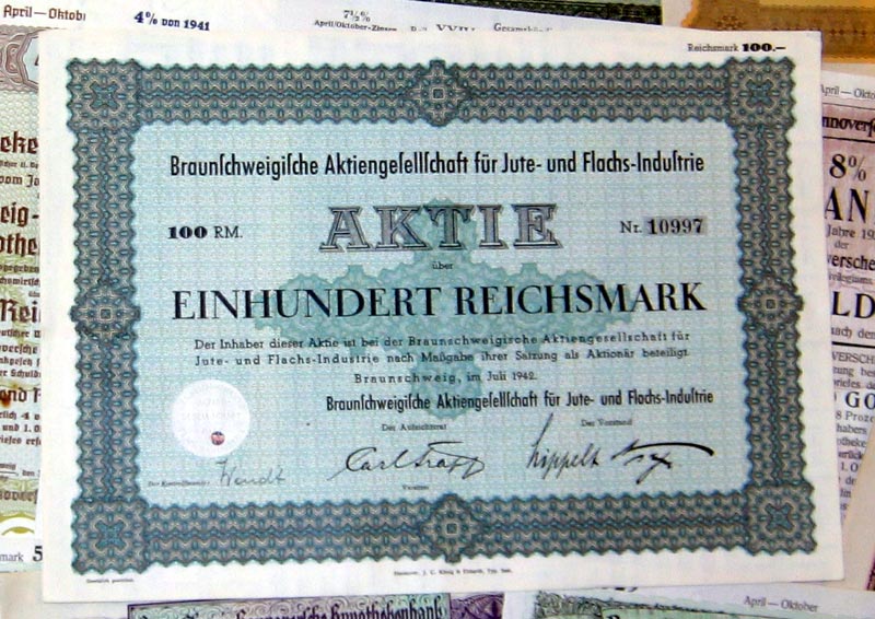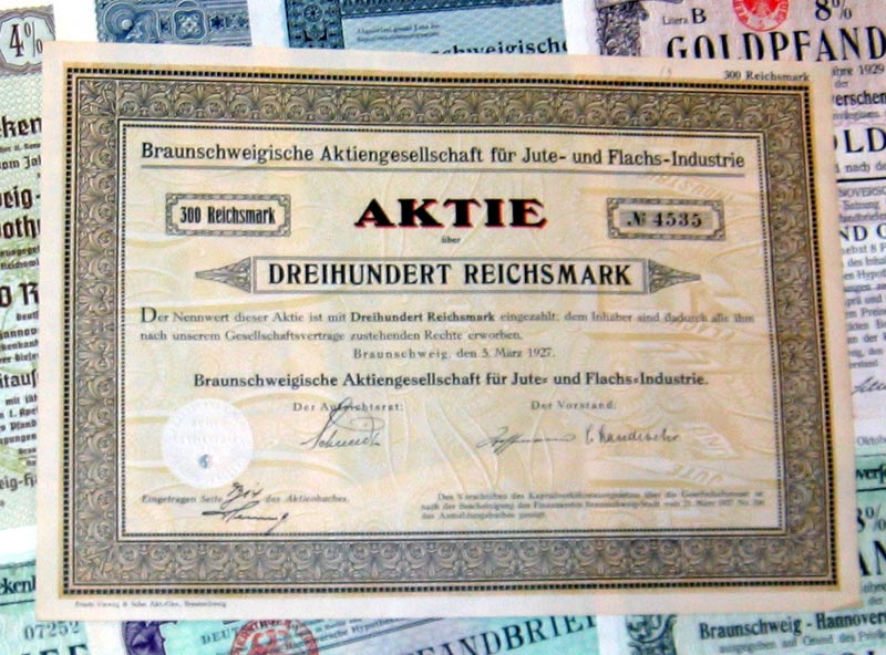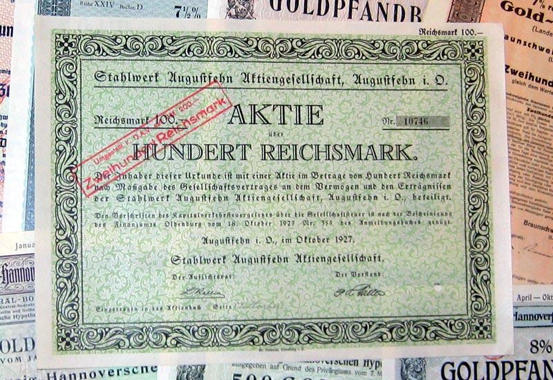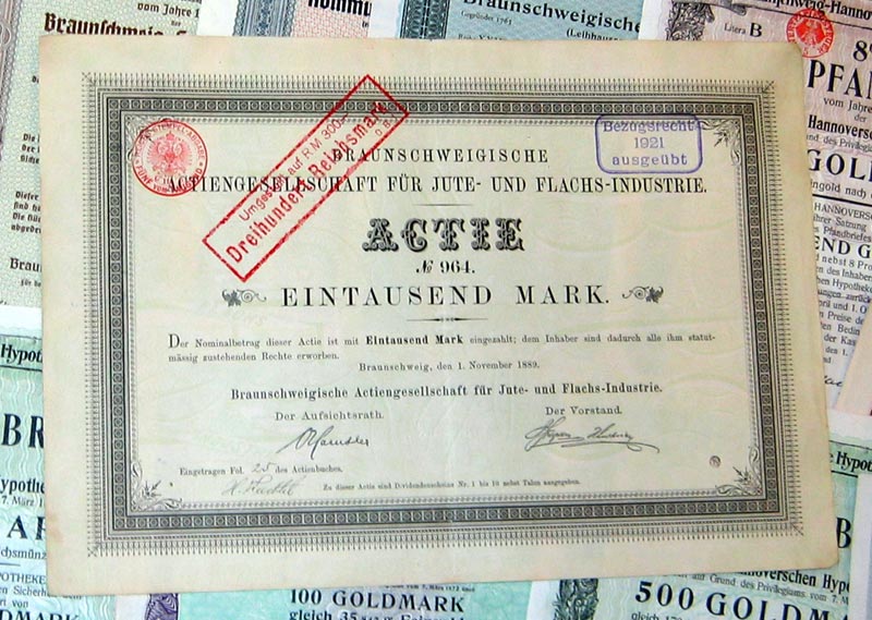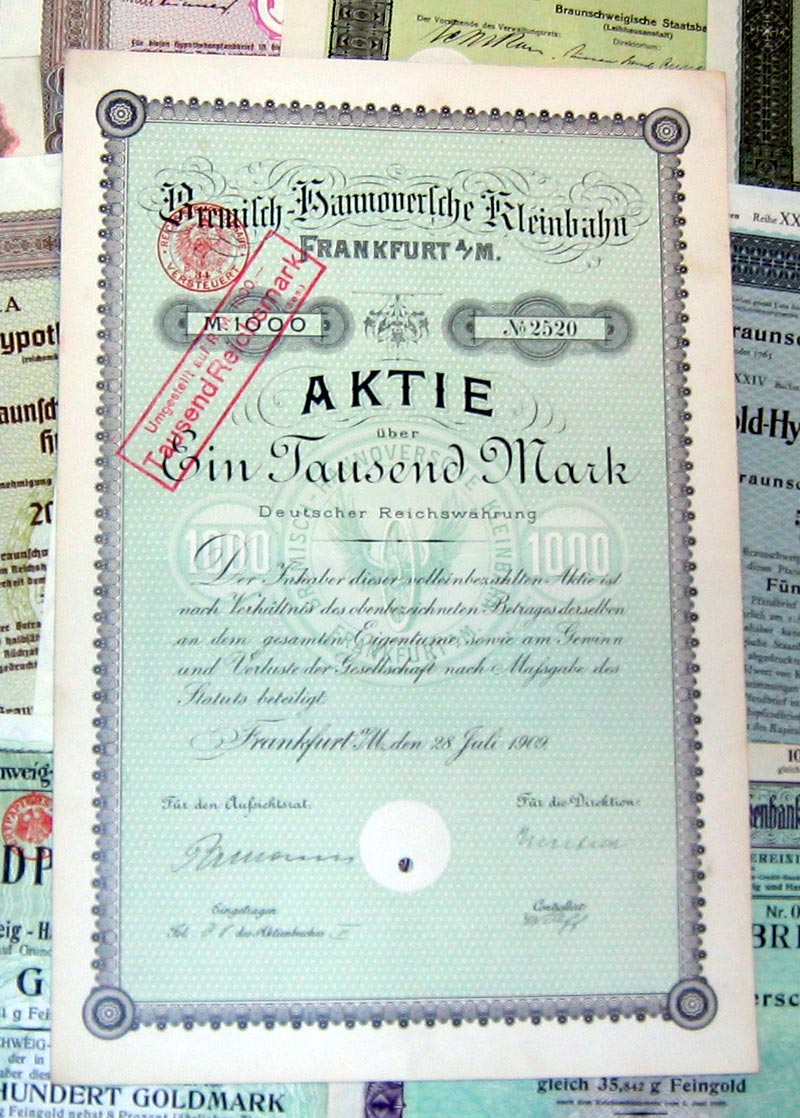 | 109 verschiedene HWPs aus Niedersachsen der Jahre 1889-1942             | | Beschreibung: | 109 verschiedene echte und originale Aktien und Anleihen aus den Jahren 1889-1942. Dabei eine Gründerzeit-Aktie aus dem vorletzten Jahrhundert und einige Papiere aus dem Kaiserreich (1871-1918). Zum Teil super-dekorativ und großformatig. Alles in sammelwürdiger Erhaltung. Dabei wissentlich keine Knochen bzw. keine 3. Wahl. Enthalten sind diverse Banken-, Stadt-, Staats- und Textil-Titel, zum Teil dekorativ, Aktien und Anleihen folgender Unternehmen: Braunschweig-Hannoversche Hypothekenbank Braunschweigische AG für Jute- und Flachs-Industrie Braunschweigische Staatsbank Bremisch-Hannoversche Kleinbahn Chemische und metallurgische Fabrik Aktiengesellschaft Hannoversche Bodenkredit-Bank Norddeutsche Hochseefischerei AG Stahlwerk Augustfehn AG Superphosphatfabrik Nordenham AG Viele in kompletten und langen Serien. Dabei zum Beispiel Aktien Gold-Hypothekenpfandbrief Gold-Pfandbrief Hypotheken-Pfandbrief Kommunal-Schuldverschreibung Vorzugsaktie Dabei die seltenen Wertstufen 2.000 und 5.000 Reichsmark. Währungen: Goldmark, Reichsmark, Mark.