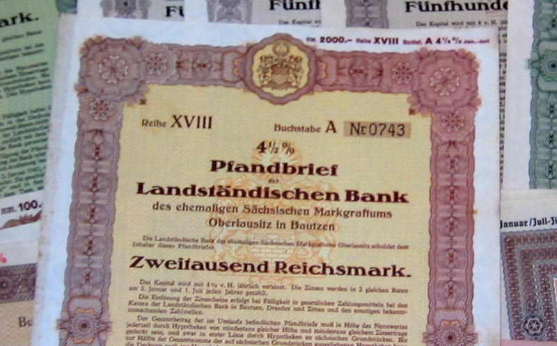 Aktien Aufwertungs-Schuldverschreibung Auslosungsschein Gold-Hypothekenpfandbrief Gold-Pfandbrief Grundrentenbrief Gutschein Gutschein zur Aufwertungs-Schuldverschreibung Gutschein-Kreditbrief Hypotheken-Pfandbrief Kommunal-Schuldverschreibung Kommunal-Schuldverschreibung-Obligation Kreditbrief Landeskultur-Rentenschein Pfandbrief Schuldverschreibung Stadtanleihe-Schuldschein