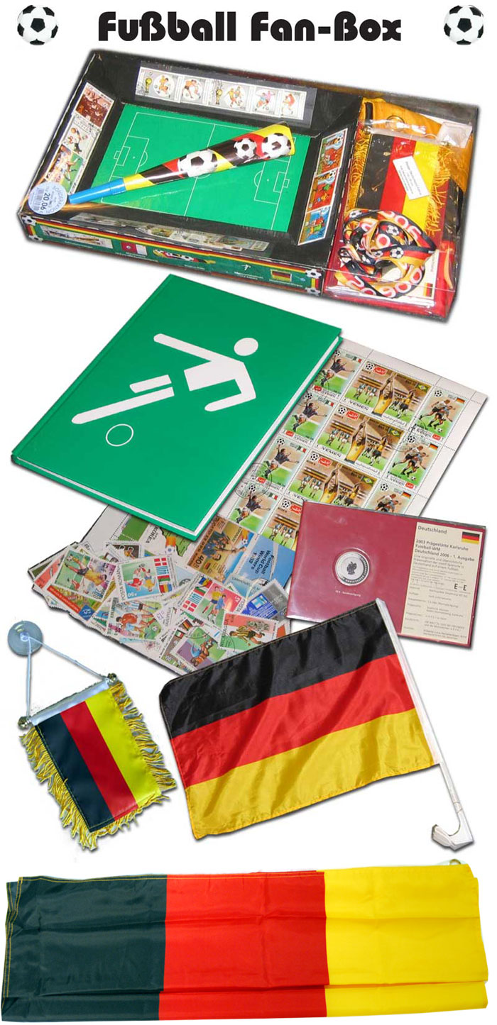 Enthalten sind neben 200 verschiedenen Fußball-Briefmarken (inkl. Kleinbogen, Block bzw. kpl. Sätzen) ein 16-seitiges Briefmarken-Einsteckbuch im Fussball-Look, diverse Münztabletts für die 10-Euro-WM-Sonderprägungen, ein Deutschland-Wimpel, ein Schlüsselanhänger und zum jubeln eine Stadion-Tröte, eine 1,5 Meter x 0,9 Meter große Deutschland-Fahne sowie eine Autofahne! Das ganze wird Ihnen in einer Box präsentiert, die äußerlich einem Stadion nachempfunden ist.